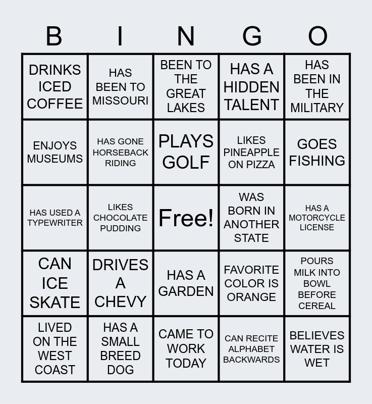 This bingo card has a free space and 24 words: LIVED ON THE WEST COAST, DRIVES A CHEVY, PLAYS GOLF, CAN RECITE ALPHABET BACKWARDS, HAS BEEN IN THE MILITARY, DRINKS ICED COFFEE, HAS BEEN TO MISSOURI, BEEN TO THE GREAT LAKES, WAS BORN IN ANOTHER STATE, HAS A MOTORCYCLE LICENSE, HAS USED A TYPEWRITER, HAS GONE HORSEBACK RIDING, FAVORITE COLOR IS ORANGE, POURS MILK INTO BOWL BEFORE CEREAL, ENJOYS MUSEUMS, HAS A SMALL BREED DOG, CAME TO WORK TODAY, HAS A HIDDEN TALENT, GOES FISHING, CAN ICE SKATE, LIKES CHOCOLATE PUDDING, HAS A GARDEN, LIKES PINEAPPLE ON PIZZA and BELIEVES WATER IS WET.