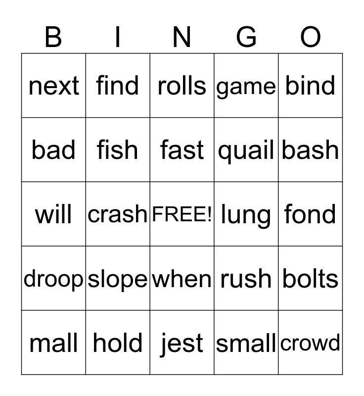 This bingo card has a free space and 24 words: slope, hold, fast, mall, bind, next, bad, find, lung, when, quail, will, rush, bolts, fish, small, fond, rolls, bash, crash, crowd, droop, game and jest.