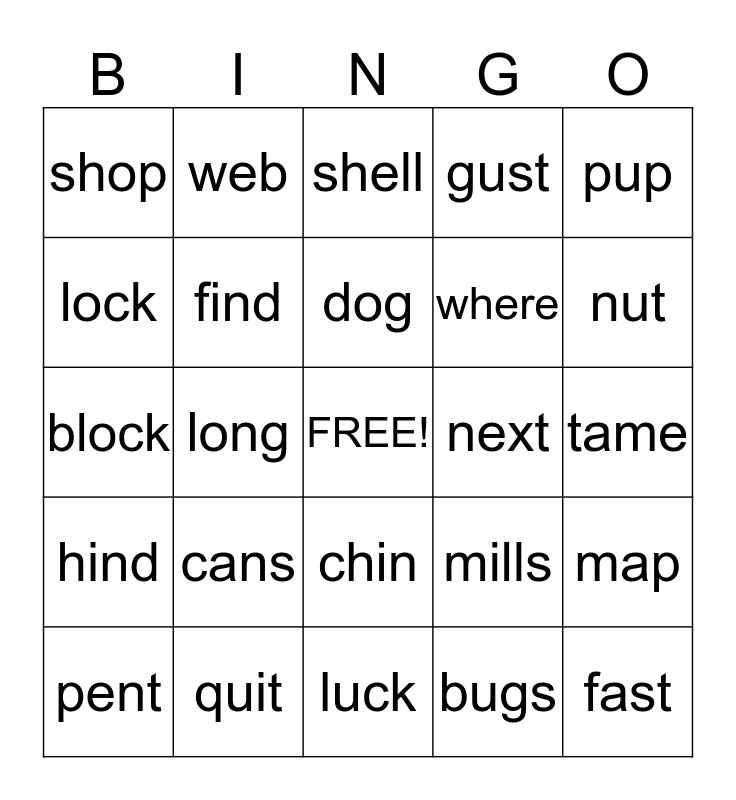 This bingo card has a free space and 24 words: cans, quit, dog, pent, pup, shop, lock, web, next, chin, where, block, mills, map, find, bugs, tame, shell, nut, long, fast, hind, gust and luck.