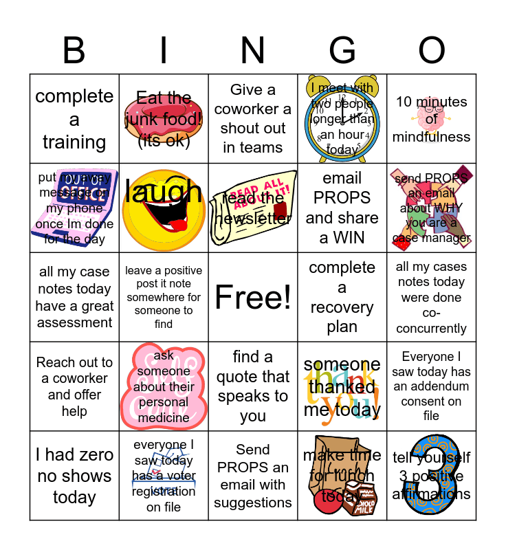 This bingo card has 12 images, a free space and 24 words: ask someone about their personal medicine, everyone I saw today has a voter registration on file, read the newsletter, I had zero no shows today, 10 minutes of mindfulness, complete a training, put my away message on my phone once Im done for the day, Eat the junk food! (its ok), complete a recovery plan, find a quote that speaks to you, email PROPS and share a WIN, all my case notes today have a great assessment, someone thanked me today, Everyone I saw today has an addendum consent on file, laugh, make time for lunch today, all my cases notes today were done co-concurrently, Give a coworker a shout out in teams, send PROPS an email about WHY you are a case manager, leave a positive post it note somewhere for someone to find, tell yourself 3 positive affirmations, Reach out to a coworker and offer help, I meet with two people longer than an hour today and Send PROPS an email with suggestions.