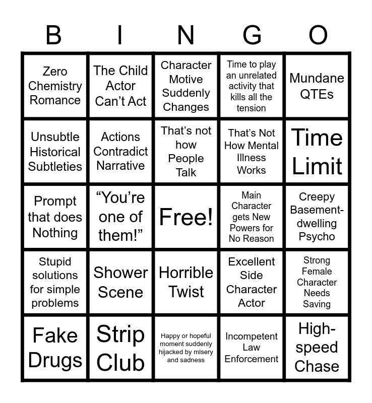 This bingo card has a free space and 24 words: Shower Scene, Strip Club, That’s not how People Talk, Fake Drugs, Mundane QTEs, Zero Chemistry Romance, Unsubtle Historical Subtleties, The Child Actor Can’t Act, Main Character gets New Powers for No Reason, Horrible Twist, That’s Not How Mental Illness Works, Prompt that does Nothing, Excellent Side Character Actor, Strong Female Character Needs Saving, Actions Contradict Narrative, Incompetent Law Enforcement, Creepy Basement-dwelling Psycho, Character Motive Suddenly Changes, Time Limit, “You’re one of them!”, High-speed Chase, Stupid solutions for simple problems, Time to play an unrelated activity that kills all the tension and Happy or hopeful moment suddenly hijacked by misery and sadness.