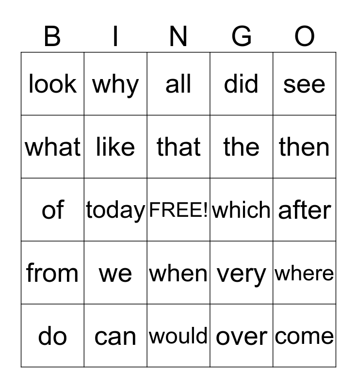 This bingo card has a free space and 24 words: we, can, that, do, see, look, what, why, which, when, the, of, very, where, like, over, after, all, then, today, come, from, did and would.