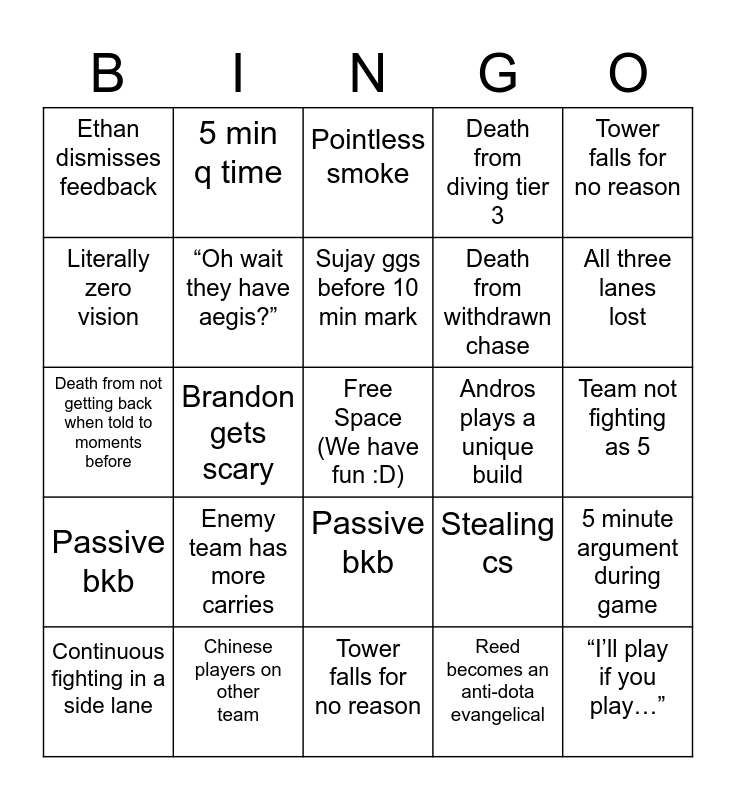 This bingo card has a free space and 24 words: Enemy team has more carries, Chinese players on other team, Sujay ggs before 10 min mark, Continuous fighting in a side lane, Tower falls for no reason, Ethan dismisses feedback, Literally zero vision, 5 min q time, Andros plays a unique build, Passive bkb, Death from withdrawn chase, Death from not getting back when told to moments before, Stealing cs, 5 minute argument during game, “Oh wait they have aegis?”, Reed becomes an anti-dota evangelical, Team not fighting as 5, Pointless smoke, All three lanes lost, Brandon gets scary, “I’ll play if you play…”, Passive bkb, Death from diving tier 3 and Tower falls for no reason.