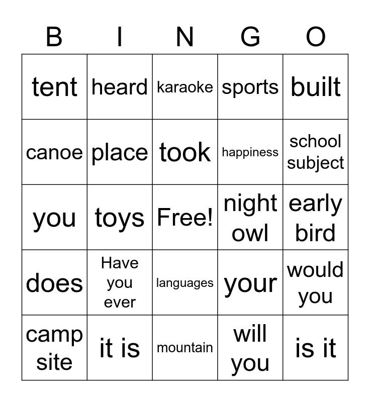 This bingo card has a free space and 25 words: Have you ever, mountain, took, camp site, built, tent, canoe, heard, night owl, languages, happiness, you, your, would you, place, evening, early bird, karaoke, school subject, toys, is it, it is, does, sports and will you.