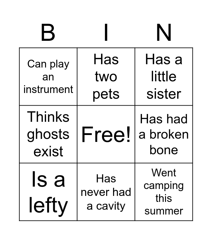 This bingo card has a free space and 8 words: Has had a broken bone, Has a little sister, Has two pets, Is a lefty, Can play an instrument, Went camping this summer, Thinks ghosts exist and Has never had a cavity.