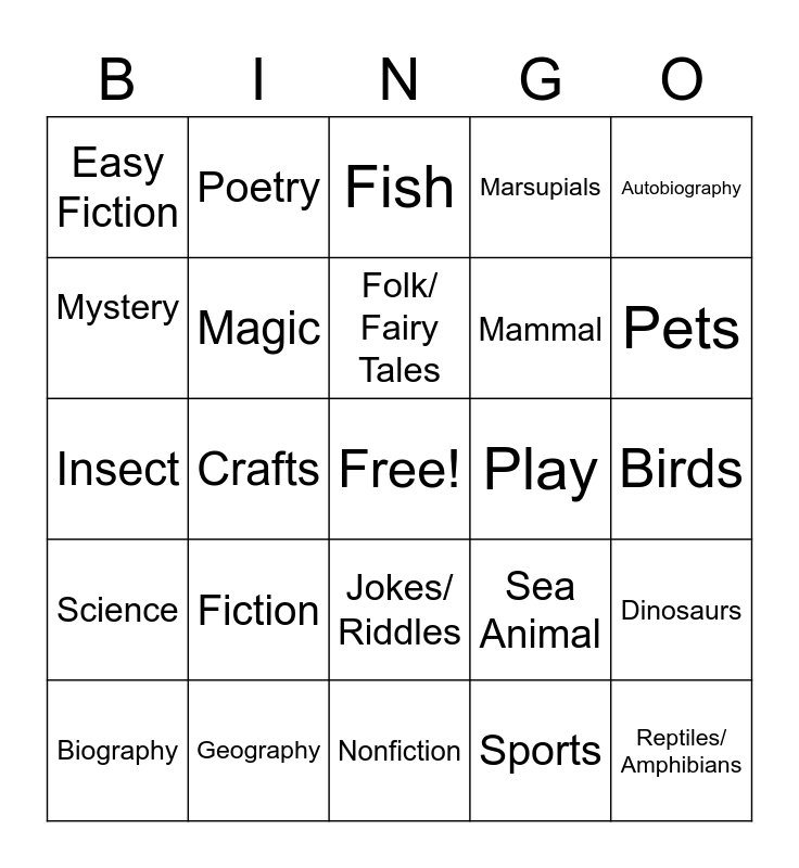 This bingo card has a free space and 25 words: Fiction, Nonfiction, Folk/ Fairy Tales, Biography, Autobiography, Easy Fiction, Mystery, Poetry, Play, Jokes/ Riddles, Mammal, Insect, Sea Animal, Dinosaurs, Magic, Racing, Birds, Fish, Pets, Crafts, Reptiles/ Amphibians, Geography, Science, Marsupials and Sports.