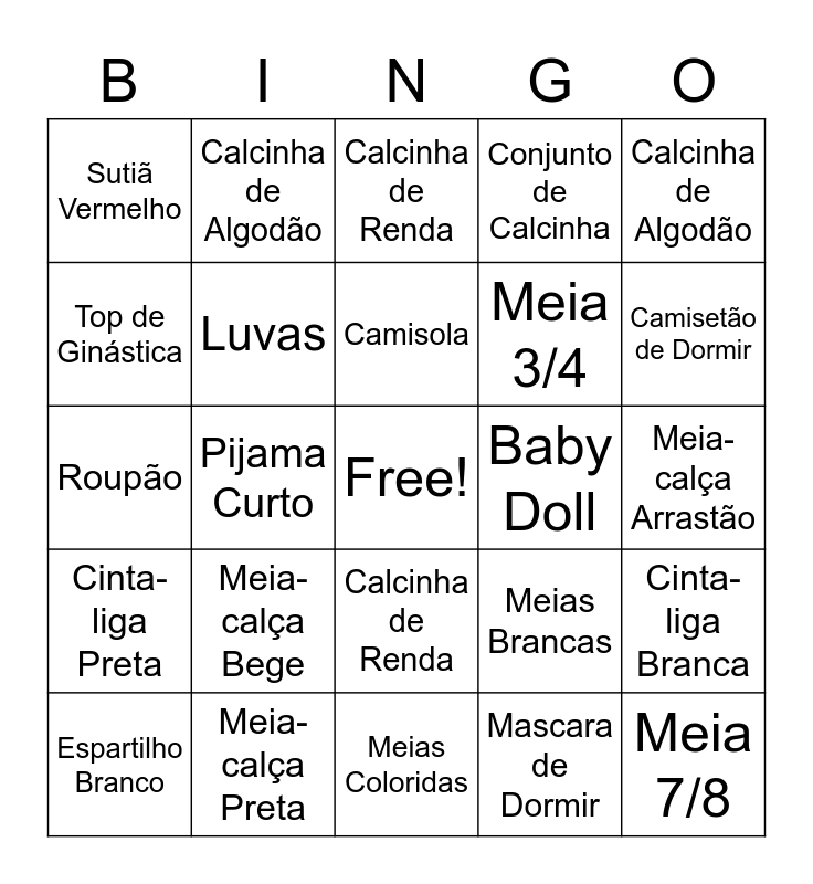 This bingo card has a free space and 27 words: Meias Brancas, Camisola, Meia 3/4, Meias Coloridas, Top de Ginástica, Calcinha de Renda, Calcinha de Algodão, Cinta-liga Preta, Baby Doll, Cinta-liga Branca, Roupão, Conjunto de Calcinha, Espartilho Branco, Meia-calça Preta, Camisetão de Dormir, Top de Ginástica, Luvas, Camisola, Meia-calça Bege, Sutiã Vermelho, Meia-calça Arrastão, Mascara de Dormir, Pijama Curto, Meia 7/8, Calcinha de Renda, Calcinha de Algodão and Biquíni.