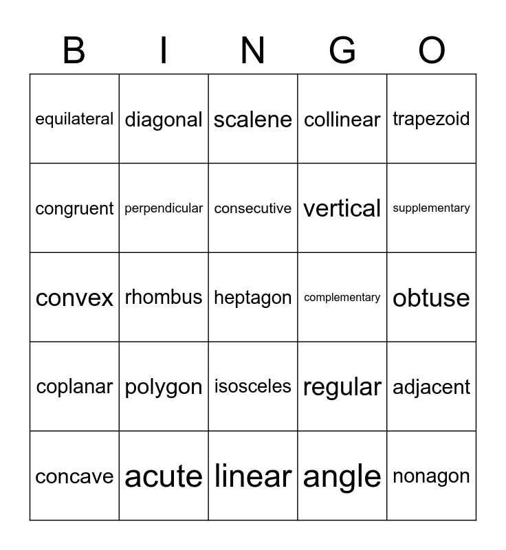 This bingo card has a free space and 24 words: polygon, acute, consecutive, concave, trapezoid, equilateral, congruent, diagonal, complementary, isosceles, vertical, convex, regular, adjacent, perpendicular, angle, obtuse, scalene, supplementary, rhombus, nonagon, coplanar, collinear and linear.