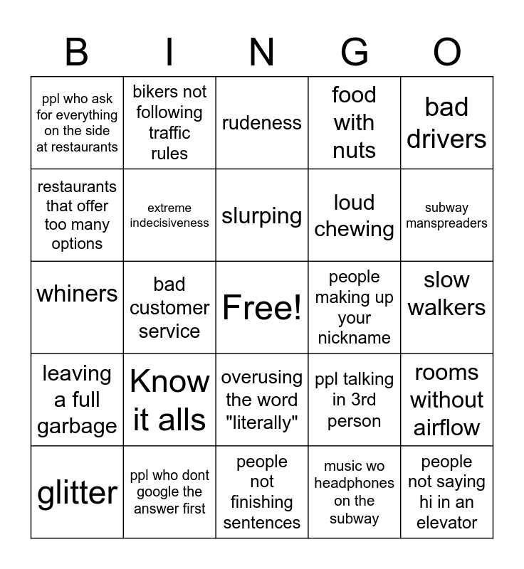 This bingo card has a free space and 24 words: Know it alls, ppl who dont google the answer first, slurping, glitter, bad drivers, ppl who ask for everything on the side at restaurants, restaurants that offer too many options, bikers not following traffic rules, people making up your nickname, overusing the word "literally", loud chewing, whiners, ppl talking in 3rd person, rooms without airflow, extreme indecisiveness, music wo headphones on the subway, slow walkers, rudeness, subway manspreaders, bad customer service, people not saying hi in an elevator, leaving a full garbage, food with nuts and people not finishing sentences.