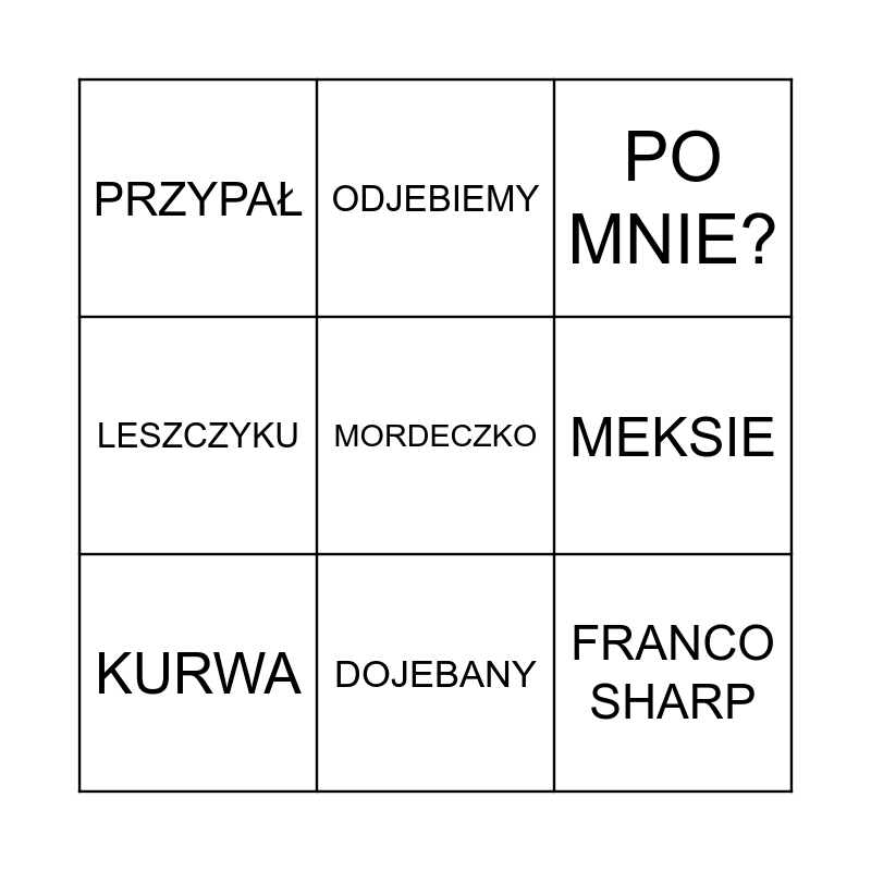 This bingo card has a free space and 8 words: MEKSIE, PO MNIE?, ODJEBIEMY, KURWA, PRZYPAŁ, FRANCO SHARP, LESZCZYKU and DOJEBANY.