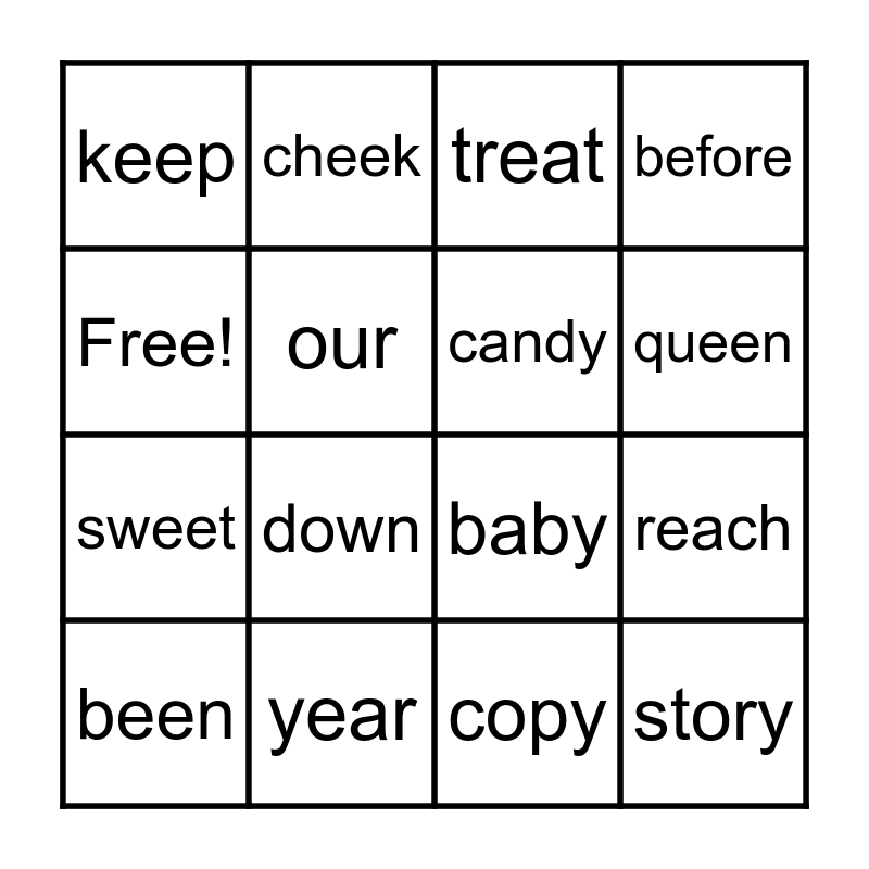 This bingo card has 16 words: year, reach, treat, keep, sweet, cheek, baby, copy, Free!, our, been, before, down, queen, candy and story.
