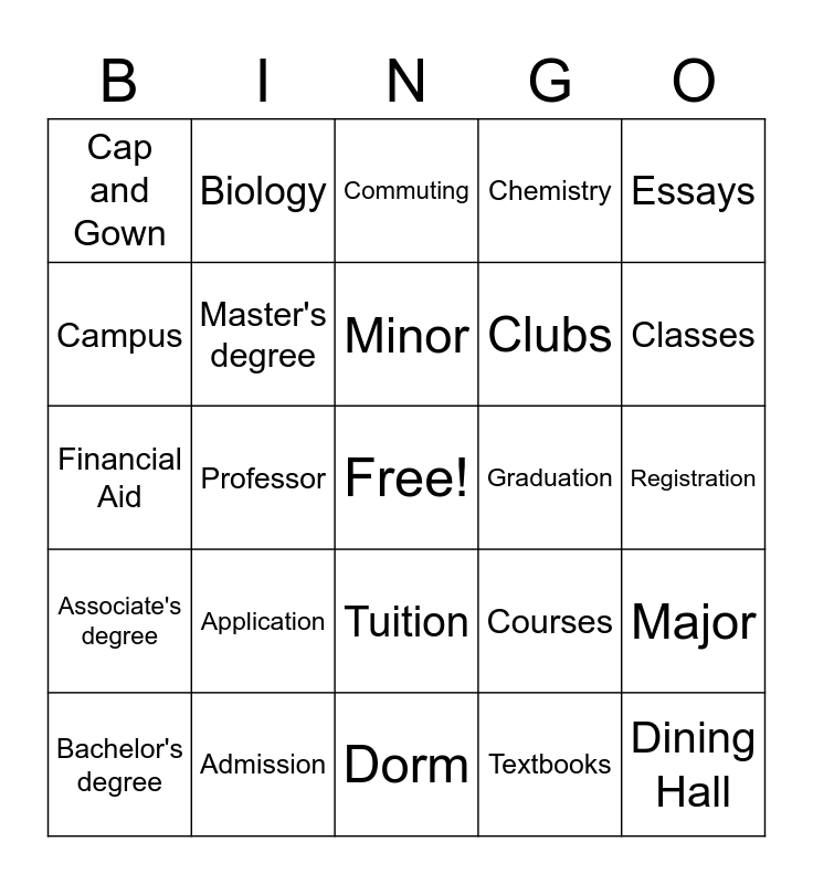 This bingo card has a free space and 29 words: Bachelor's degree, Grant, Professor, College Sports, Cap and Gown, Commuting, Master's degree, Application, Graduation, Admission, Registration, Dining Hall, Dorm, Textbooks, Classes, Scholarship, Tuition, Associate's degree, Essays, Financial Aid, Courses, Study, Clubs, Campus, Chemistry, Biology, Major, Minor and Art.