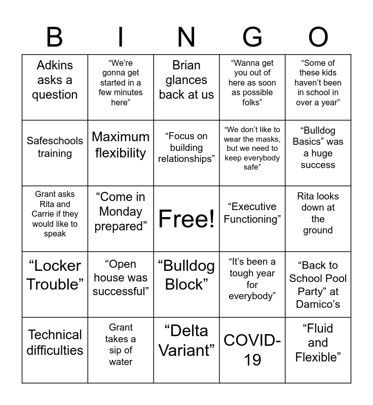 This bingo card has a free space and 24 words: Technical difficulties, “Open house was successful”, “Focus on building relationships”, COVID-19, “Some of these kids haven’t been in school in over a year”, Adkins asks a question, “We’re gonna get started in a few minutes here”, Brian glances back at us, “Executive Functioning”, Rita looks down at the ground, Grant asks Rita and Carrie if they would like to speak, Maximum flexibility, “It’s been a tough year for everybody”, “Back to School Pool Party” at Damico’s, Safeschools training, Grant takes a sip of water, “Delta Variant”, “Wanna get you out of here as soon as possible folks”, “Bulldog Basics” was a huge success, “Locker Trouble”, “Come in Monday prepared”, “Bulldog Block”, “We don’t like to wear the masks, but we need to keep everybody safe” and “Fluid and Flexible”.