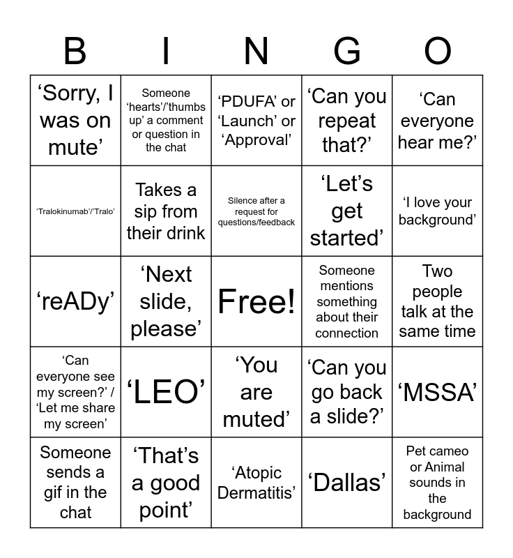 This bingo card has a free space and 24 words: ‘LEO’, ‘That’s a good point’, Silence after a request for questions/feedback, Someone sends a gif in the chat, ‘Can everyone hear me?’, ‘Sorry, I was on mute’, ‘Tralokinumab’/’Tralo’, Someone ‘hearts’/’thumbs up’ a comment or question in the chat, Someone mentions something about their connection, ‘You are muted’, ‘Let’s get started’, ‘reADy’, ‘Can you go back a slide?’, ‘MSSA’, Takes a sip from their drink, ‘Dallas’, Two people talk at the same time, ‘PDUFA’ or ‘Launch’ or ‘Approval’, ‘I love your background’, ‘Next slide, please’, Pet cameo or Animal sounds in the background, ‘Can everyone see my screen?’ / ‘Let me share my screen’, ‘Can you repeat that?’ and ‘Atopic Dermatitis’.