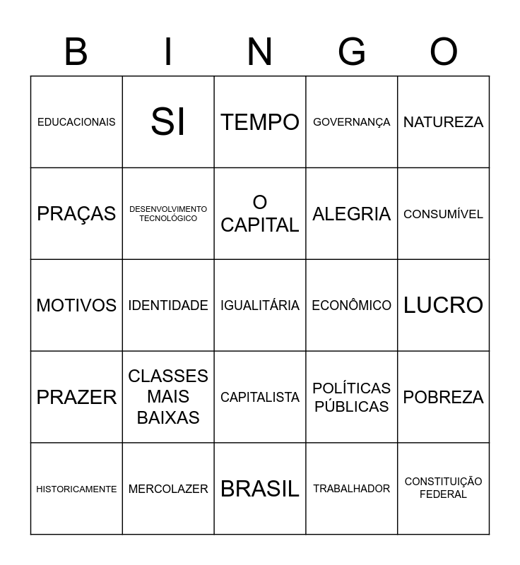 This bingo card has a free space and 34 words: LAZER, TRABALHADOR, OCUPAÇÕES, CULTURA CAPITALISTA, PRAZER, DESENVOLVIMENTO TECNOLÓGICO, NATUREZA, HISTORICAMENTE, SI, TRABALHO, O CAPITAL, TEMPO, REVOLUÇÃO INDUSTRIAL, ÓCIO, ECONÔMICO, CONSUMÍVEL, MERCOLAZER, MOTIVOS, CLASSES MAIS BAIXAS, POLÍTICAS PÚBLICAS, CAPITALISTA, O ESTADO, EDUCACIONAIS, LUCRO, BRASIL, CONSTITUIÇÃO FEDERAL, GOVERNANÇA, DINHEIRO, ALEGRIA, PRAÇAS, SECRETARIAS, IDENTIDADE, POBREZA and PROPAGAÇÃO.