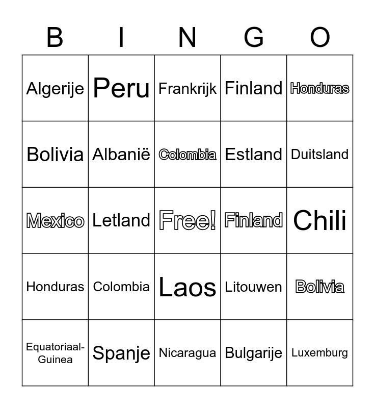 This bingo card has a free space and 110 words: Paraguay, Slovenië, Finland, Perú, Dominicaanse Republiek, België, Noorwegen, Bolivia, Oostenrijk, Duitsland, Argentinië, Cyprus, Panama, Chili, Costa Rica, Bulgarije, Mexico, Hongarije, Nicaragua, Litouwen, Bolivia, Frankrijk, Griekenland, Colombia, Uruguay, Colombia, Honduras, Spanje, El Salvador, België, Duitsland, Finland, Frankrijk, Ierland, Italië, Luxemburg, Oostenrijk, Portugal, Spanje, UK, Zweden, Cyprus, Estland, Letland, Litouwen, Malta, Polen, Slovenië, Slowakije, Tsjechië, Noorwegen, Roemenië, Bulgarije, Zwitserland, IJsland, Griekenland, Hongarije, Denemarken., Afghanistan, Albanië, Algerije, Andorra, Angola, Mexico., Spanje, Colombia, Bahama's, Bahrein, Bangladesh, Barbados, België, Argentinië, Peru, Venezuela, Cambodja, Canada, Centraal-Afrikaans Republiek, Chili, China, Colombia, Comoren, Congo- Brazzavile, Chili, Ecuador, Guatemala., Cuba, Ierland, IJsland, India, Indonesië, Irak, Bolivia, Dominicaanse Republiek, Honduras, El Salvador, Paraguay, Jamaica, Japan, Jemen, Nicaragua, Costa Rica, Panama, Uruguay, Equatoriaal-Guinea, Laos, Lesotho, Letland, Libanon, Liberia and Libië.
