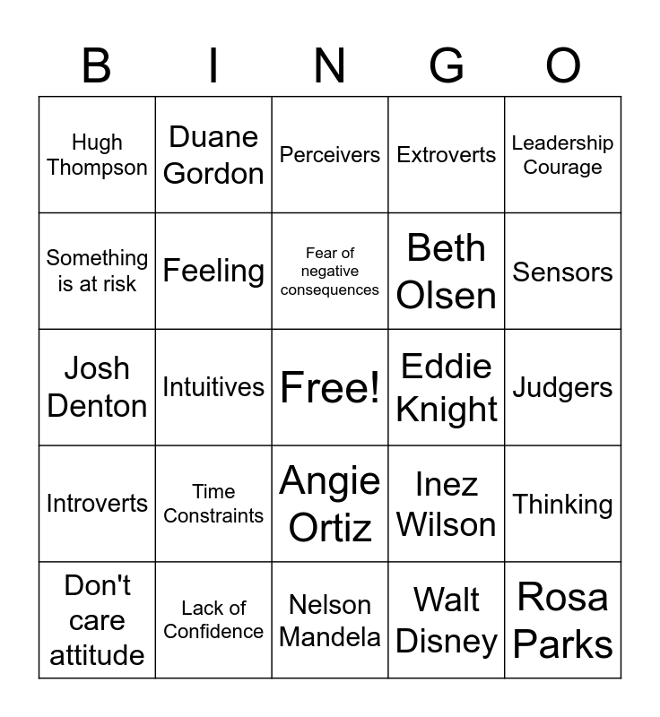 This bingo card has a free space and 24 words: Time Constraints, Lack of Confidence, Fear of negative consequences, Don't care attitude, Leadership Courage, Hugh Thompson, Something is at risk, Duane Gordon, Eddie Knight, Angie Ortiz, Beth Olsen, Josh Denton, Inez Wilson, Thinking, Feeling, Walt Disney, Judgers, Perceivers, Sensors, Intuitives, Rosa Parks, Introverts, Extroverts and Nelson Mandela.
