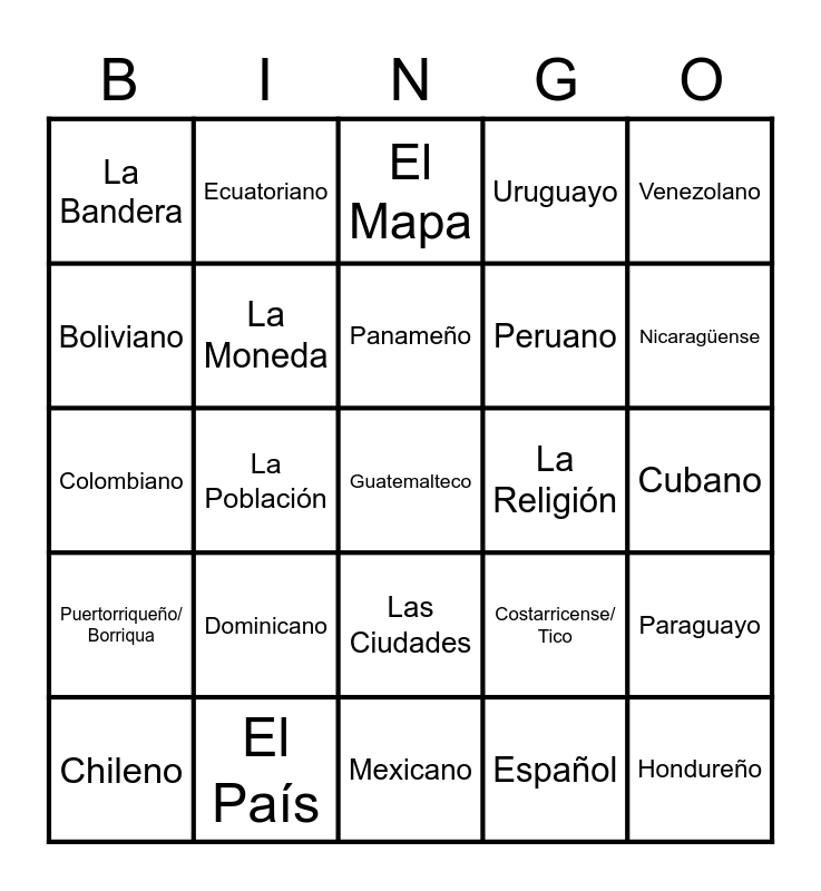 This bingo card has 30 words: El País, La Capital, La Población, Sitios Famosos, La Bandera, El Mapa, La Moneda, Las Ciudades, La Religión, Mexicano, Cubano, Guatemalteco, Español, Hondureño, Nicaragüense, Salvadoreño, Costarricense/ Tico, Puertorriqueño/ Borriqua, Dominicano, Venezolano, Colombiano, Argentino, Ecuatoriano, Peruano, Boliviano, Uruguayo, Paraguayo, Chileno, Panameño and Ecuatoguineano.
