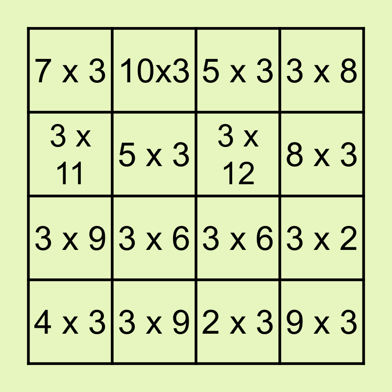 This bingo card has 16 words: 3 x 9, 3 x 2, 5 x 3, 7 x 3, 3 x 9, 10x3, 3 x 6, 2 x 3, 3 x 11, 5 x 3, 4 x 3, 3 x 8, 3 x 6, 8 x 3, 3 x 12 and 9 x 3.