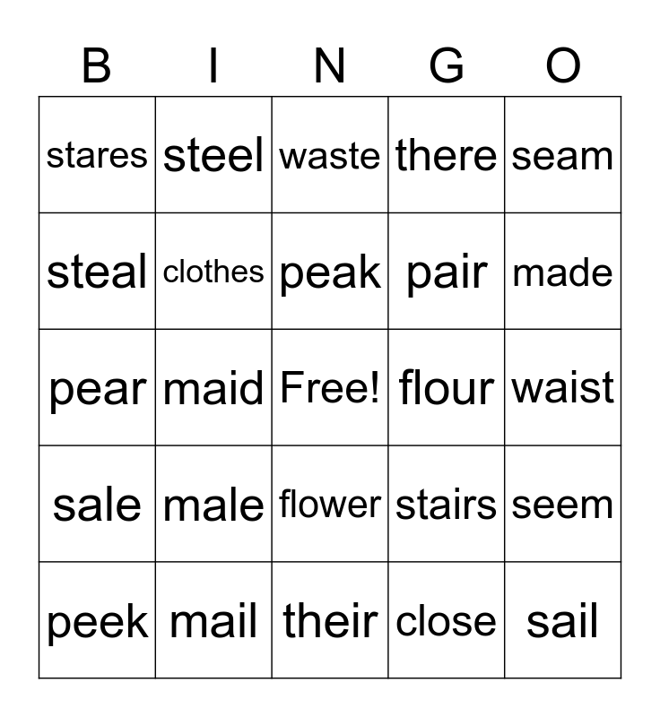 This bingo card has a free space and 24 words: male, mail, peak, peek, seam, stares, steal, steel, flour, flower, pair, pear, stairs, seem, clothes, close, waist, waste, made, maid, sail, sale, there and their.