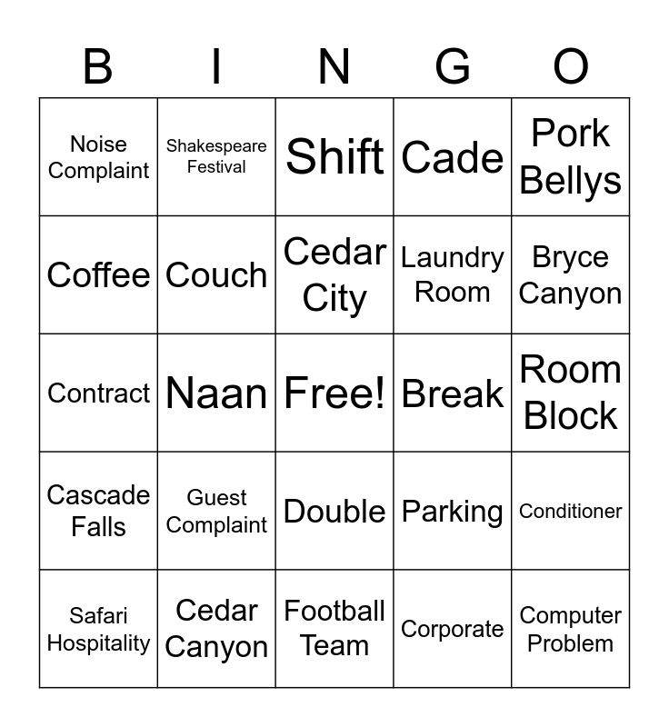This bingo card has a free space and 114 words: Check In, Early Check In, Late Check Out, Sales, Housekeeping, Front Desk, Cade, Trey, Dolly, Shower, Sink, Bed, Sofa, Suite, Queen, King, Double, Calendar, Hotel, Marriott, Safari Hospitality, Shift, Auditor, Grounds Keeper, Meeting Room, Cascade Falls, Cedar Canyon, Kolob Canyon, Glen Canyon, Cedar Breaks, Bryce Canyon, Cedar City, Naan, Air Conditioner, Toilet, The Bistro, Karli, The Kitchen, Catering, Pool, Jacuzzi, Sleeping Room, I-15, Utah, ADR, Goal, Corporate, Coffee, Breakfast, Lunch, Dinner, Break, Snack, Hand Sanitizer, Covid, Courtyard, Towels, Washing Machine, Blow Dryer, Shampoo, Conditioner, Body Wash, Soap, Mirror, Microwave, Break Room, Fridge, Couch, Contract, Guest, Room Block, Group, Computer, Rack Rate, Drunk Guest, Computer Problem, Guest Complaint, Noise Complaint, Credit Card Declined, Extra Towels, Key Card Doesn't Work, Shakespeare Festival, Free Wifi, Parking, Laundry Room, Bed Bug, All American Diner, Coal Creek Rd, Main Street, The Grind Coffee, Centro Pizza, Silver Silo, Asian Bistro, Pork Bellys, The Pizza Cart, Bruno's, Erwan Thai, Tacos El Jefe, Costa Vida, Brodys, Hermies, Lins, Brick House Cafe, Chef Alfredos, The Pastry Pub, Ninja, SUU, Football Team, Volleyball Team, Baseball Team, Kids Running Down Hallway, Milts, Rustys and Flood.