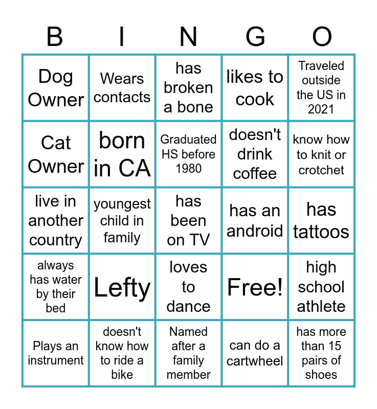 This bingo card has 25 words: Lefty, Named after a family member, Graduated HS before 1980, Plays an instrument, Traveled outside the US in 2021, Dog Owner, Cat Owner, Wears contacts, has an android, loves to dance, doesn't drink coffee, live in another country, Free!, high school athlete, born in CA, has more than 15 pairs of shoes, has tattoos, has broken a bone, know how to knit or crotchet, youngest child in family, has been on TV, doesn't know how to ride a bike, always has water by their bed, likes to cook and can do a cartwheel.