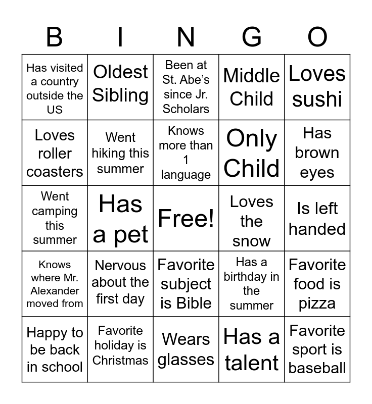 This bingo card has a free space and 24 words: Nervous about the first day, Favorite holiday is Christmas, Knows more than 1 language, Happy to be back in school, Loves sushi, Has visited a country outside the US, Loves roller coasters, Oldest Sibling, Loves the snow, Favorite subject is Bible, Only Child, Went camping this summer, Has a birthday in the summer, Favorite food is pizza, Went hiking this summer, Has a talent, Is left handed, Been at St. Abe’s since Jr. Scholars, Has brown eyes, Has a pet, Favorite sport is baseball, Knows where Mr. Alexander moved from, Middle Child and Wears glasses.