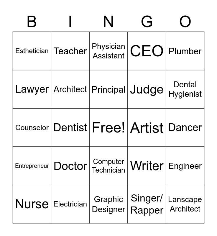 This bingo card has a free space and 24 words: Doctor, Electrician, Principal, Nurse, Plumber, Esthetician, Lawyer, Teacher, Artist, Computer Technician, Judge, Counselor, Writer, Engineer, Architect, Singer/ Rapper, Dancer, Physician Assistant, Dental Hygienist, Dentist, Lanscape Architect, Entrepreneur, CEO and Graphic Designer.