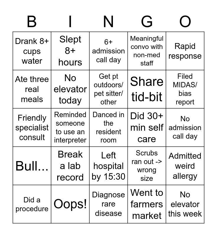 This bingo card has 25 words: Break a lab record, Diagnose rare disease, Get pt outdoors/ pet sitter/ other, Did a procedure, Rapid response, Drank 8+ cups water, Ate three real meals, Slept 8+ hours, Did 30+ min self care, Left hospital by 15:30, Share tid-bit, Friendly specialist consult, Scrubs ran out -> wrong size, Admitted weird allergy, No elevator today, No elevator this week, No admission call day, 6+ admission call day, Filed MIDAS/ bias report, Reminded someone to use an interpreter, Danced in the resident room, Oops!, Bull..., Meaningful convo with non-med staff and Went to farmers market.