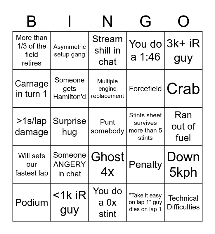 This bingo card has a free space and 45 words: Engine replacement, Technical Difficulties, On podium pace, 5+ laps down, Podium, DNF, "Take it easy on lap 1" guy dies on lap 1, Stream shill in chat, Cursed livery, 3k+ iR guy, <1k iR guy, You do a 1:46, Stints sheet survives more than 5 stints, Ghost 4x, Someone ANGERY in chat, Survive lap 1, You do a 0x stint, Unintentional Dorifto, >1s/lap damage, Forgot to brake, Crab, Asymmetric setup gang, 3+ car pileup, Get murdered, More than 1/3 of the field retires, Pit strategy overtake, Ran out of fuel, Spooky internet, sBinnala, Penalty, Will sets our fastest lap, You set our fastest lap, Down 5kph, Only one car on lead lap, Speeding in pits, 1000iQ rejoin, Surprise hug, Lapped car blocking, Red Bull Murderer, Someone goes to space, Multiple engine replacement, Carnage in turn 1, Forcefield, Will talks about his motorbike, Someone gets Hamilton'd and Forget which pit straight you're on.