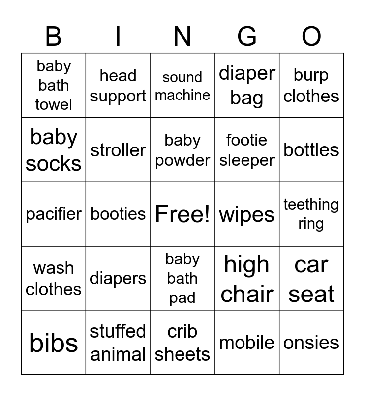 This bingo card has a free space and 24 words: diapers, stuffed animal, baby powder, bibs, burp clothes, baby bath towel, baby socks, head support, wipes, baby bath pad, footie sleeper, pacifier, high chair, car seat, stroller, mobile, teething ring, sound machine, bottles, booties, onsies, wash clothes, diaper bag and crib sheets.