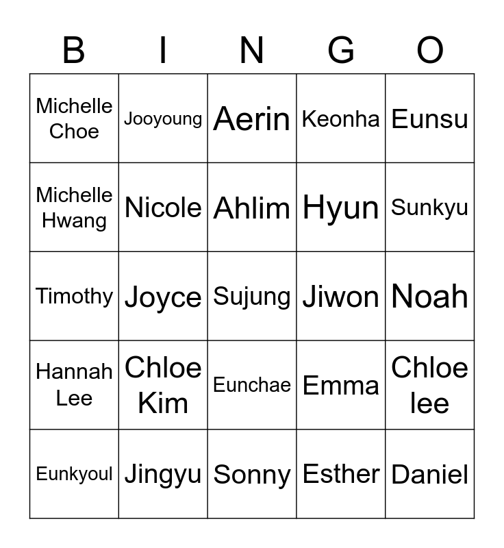 This bingo card has a free space and 33 words: Rachel, Hyunsoo, Joyce, Lauren, Hannah Lee, Nicole, Eunsu, Eunkyoul, Jooyoung, Yunah, Ahlim, Aerin, Junwoo, Ethan, Jiwon, Sunkyu, Jingyu, Timothy, Chloe Kim, Emma, Eunchae, Ahyun, Michelle Choe, Noah, Sonny, Daniel, Keonha, Hyun, Michelle Hwang, Chloe lee, Hannah Shin, Esther and Grace.