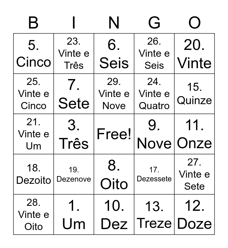 This bingo card has a free space and 30 words: 1. Um, 2. Dois, 3. Três, 4. Quatro, 5. Cinco, 6. Seis, 7. Sete, 8. Oito, 9. Nove, 10. Dez, 11. Onze, 12. Doze, 13. Treze, 14. Quatorze, 15. Quinze, 16. Dezesseis, 17. Dezessete, 18. Dezoito, 19. Dezenove, 20. Vinte, 21. Vinte e Um, 22. Vinte e Dois, 23. Vinte e Três, 24. Vinte e Quatro, 25. Vinte e Cinco, 26. Vinte e Seis, 27. Vinte e Sete, 28. Vinte e Oito, 29. Vinte e Nove and 30. Trinta.