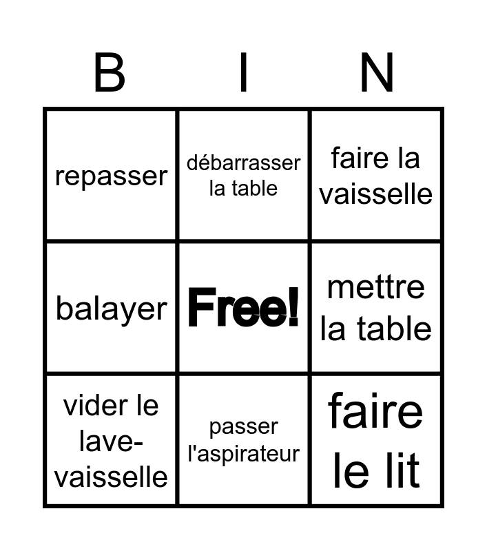 This bingo card has a free space and 11 words: ranger la chambre, passer l'aspirateur, faire le lit, vider le lave-vaisselle, débarrasser la table, faire la vaisselle, mettre la table, remplir le lave-vaisselle, balayer, repasser and sortir la poubelle.
