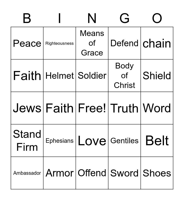 This bingo card has a free space and 24 words: Ephesians, Armor, Soldier, Ambassador, chain, Peace, Faith, Righteousness, Truth, Love, Body of Christ, Jews, Gentiles, Belt, Helmet, Sword, Word, Means of Grace, Shield, Faith, Shoes, Stand Firm, Defend and Offend.