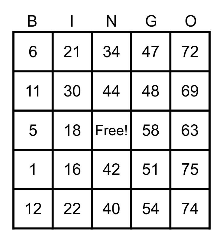 This bingo card has a free space and 24 words: 12, 16, 44, 54, 72, 6, 21, 34, 58, 63, 5, 30, 51, 75, 11, 22, 40, 47, 69, 1, 18, 42, 48 and 74.
