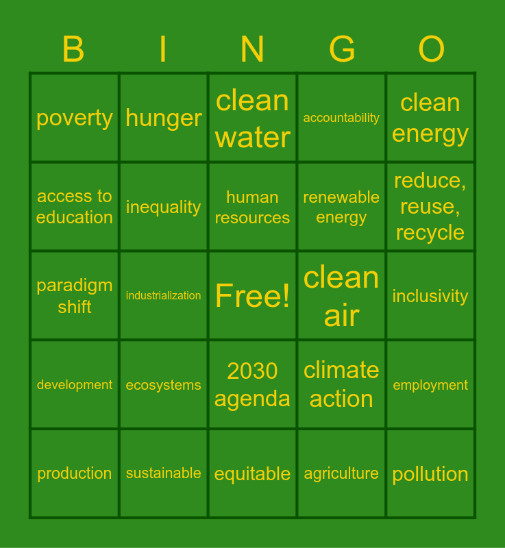 This bingo card has a free space and 25 words: development, sustainable, equitable, agriculture, clean energy, poverty, hunger, clean water, clean air, employment, access to education, inequality, biodiversity, climate action, reduce, reuse, recycle, production, industrialization, human resources, renewable energy, inclusivity, paradigm shift, ecosystems, 2030 agenda, accountability and pollution.