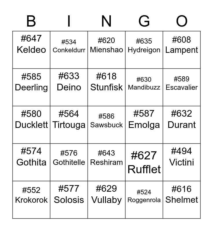 This bingo card has 25 words: #576 Gothitelle, #629 Vullaby, #618 Stunfisk, #552 Krokorok, #608 Lampent, #647 Keldeo, #585 Deerling, #534 Conkeldurr, #587 Emolga, #643 Reshiram, #630 Mandibuzz, #580 Ducklett, #627 Rufflet, #494 Victini, #633 Deino, #616 Shelmet, #632 Durant, #620 Mienshao, #589 Escavalier, #564 Tirtouga, #586 Sawsbuck, #577 Solosis, #574 Gothita, #635 Hydreigon and #524 Roggenrola.