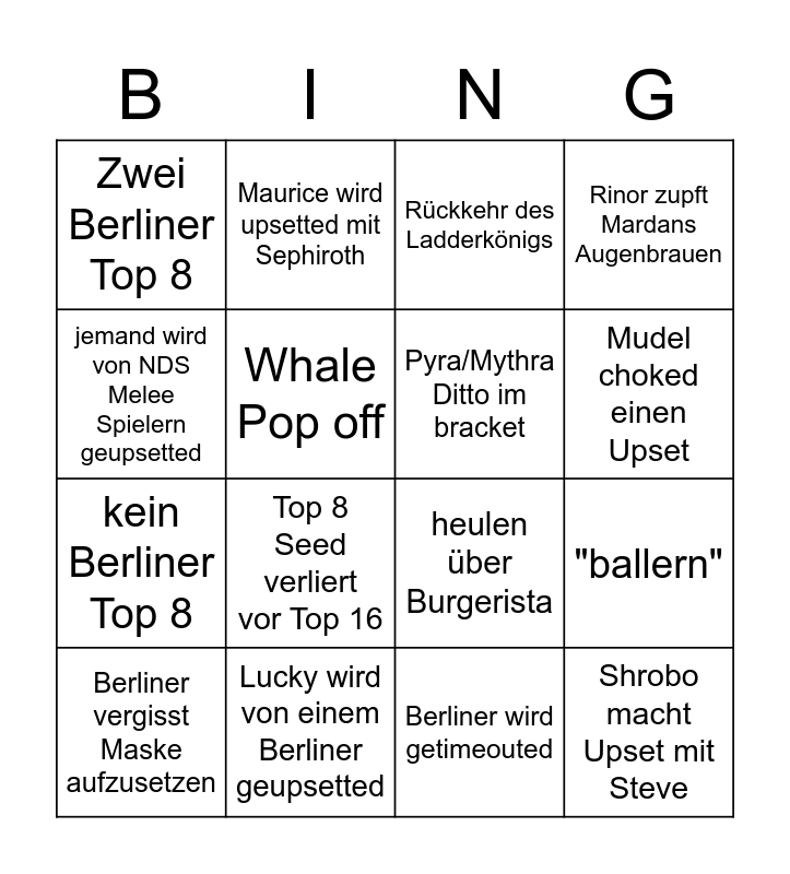 This bingo card has 16 words: Lucky wird von einem Berliner geupsetted, "ballern", Rückkehr des Ladderkönigs, Zwei Berliner Top 8, kein Berliner Top 8, Maurice wird upsetted mit Sephiroth, heulen über Burgerista, Berliner wird getimeouted, jemand wird von NDS Melee Spielern geupsetted, Whale Pop off, Berliner vergisst Maske aufzusetzen, Rinor zupft Mardans Augenbrauen, Top 8 Seed verliert vor Top 16, Mudel choked einen Upset, Pyra/Mythra Ditto im bracket and Shrobo macht Upset mit Steve.