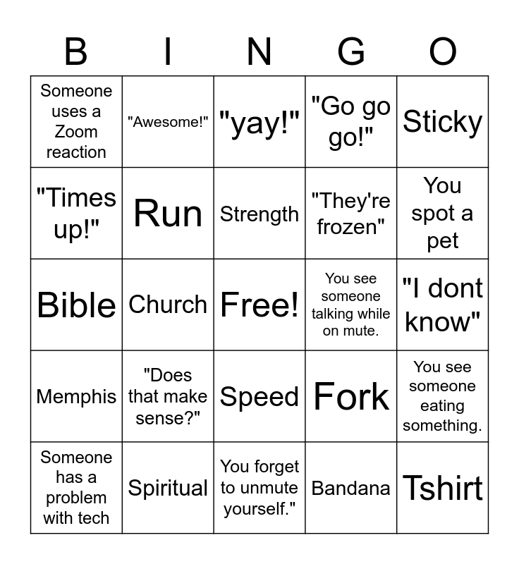 This bingo card has a free space and 24 words: "Does that make sense?", Spiritual, Strength, Someone has a problem with tech, Sticky, Someone uses a Zoom reaction, "Times up!", "Awesome!", You see someone talking while on mute., Speed, "They're frozen", Bible, Fork, You see someone eating something., Run, Bandana, "I dont know", "yay!", You spot a pet, Church, Tshirt, Memphis, "Go go go!" and You forget to unmute yourself.".