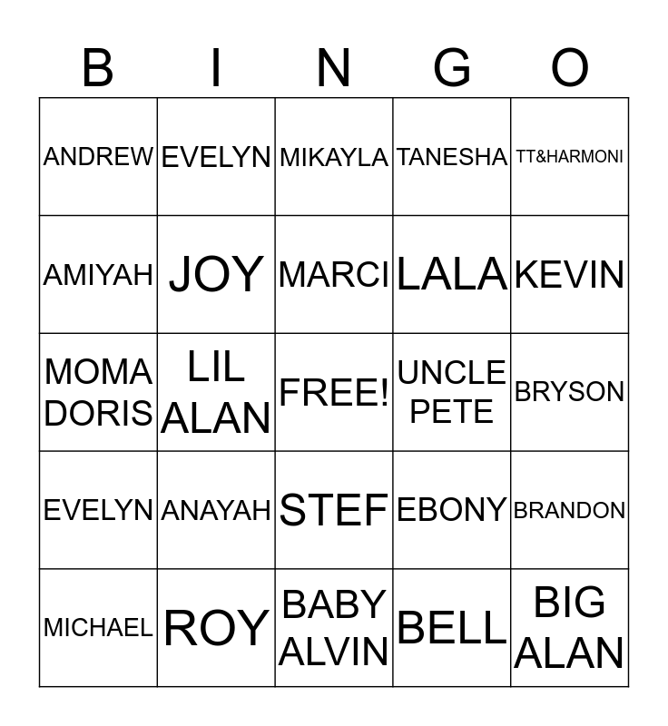 This bingo card has a free space and 25 words: ANAYAH, BABY ALVIN, MARCI, MICHAEL, TT&HARMONI, ANDREW, AMIYAH, EVELYN, UNCLE PETE, STEF, LALA, MOMA DORIS, EBONY, BRANDON, JOY, DAEVONN, BRYSON, MIKAYLA, KEVIN, LIL ALAN, BIG ALAN, ROY, EVELYN, TANESHA and BELL.