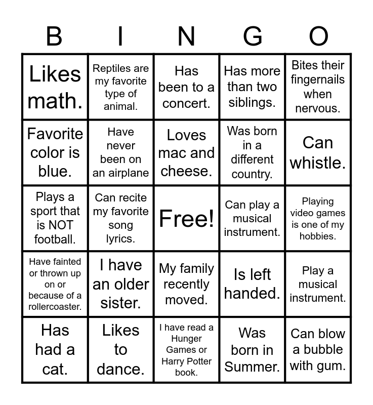 This bingo card has a free space and 48 words: Worked this summer., Can blow a bubble with gum., Was born in Fall., I have read a Hunger Games or Harry Potter book., I have an older sister., Loves to swim., Reptiles are my favorite type of animal., Has a food allergy., Favorite color is blue., Do not like broccoli., Have never been on an airplane, Has more than two siblings., Play a musical instrument., Is left handed., Lived in a different state., Has a pet that does not have fur., Loves mac and cheese., Can play a musical instrument., has a favorite pro sports team., Bites their fingernails when nervous., Can recite my favorite song lyrics., Was born in Summer., Likes math., Was born in a different country., Can do a cartwheel., Can whistle., Has had a cat., Hates pineapple on pizza., My family recently moved., Have fainted or thrown up on or because of a rollercoaster., Favorite color is red., Has been camping., Ice Cream is my favorite dessert., Favorite color is green., Likes to dance., Has had a dog., Have seen a snake in the wild., Playing video games is one of my hobbies., Has more than one pet., Is an only child., Was born in Winter., Likes Writing., Has been to a concert., Has an Iphone., Plays a sport that is NOT football., Favorite color is orange or yellow., Born in Spring. and Can speak another language..