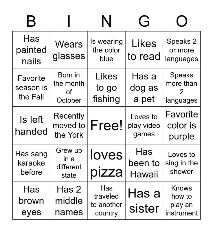 This bingo card has a free space and 24 words: Grew up in a different state, Has 2 middle names, Likes to go fishing, Has brown eyes, Speaks 2 or more languages, Has painted nails, Favorite season is the Fall, Wears glasses, Loves to play video games, loves pizza, Has a dog as a pet, Is left handed, Has been to Hawaii, Loves to sing in the shower, Born in the month of October, Has a sister, Favorite color is purple, Is wearing the color blue, Speaks more than 2 languages, Recently moved to the York, Knows how to play an instrument, Has sang karaoke before, Likes to read and Has traveled to another country.