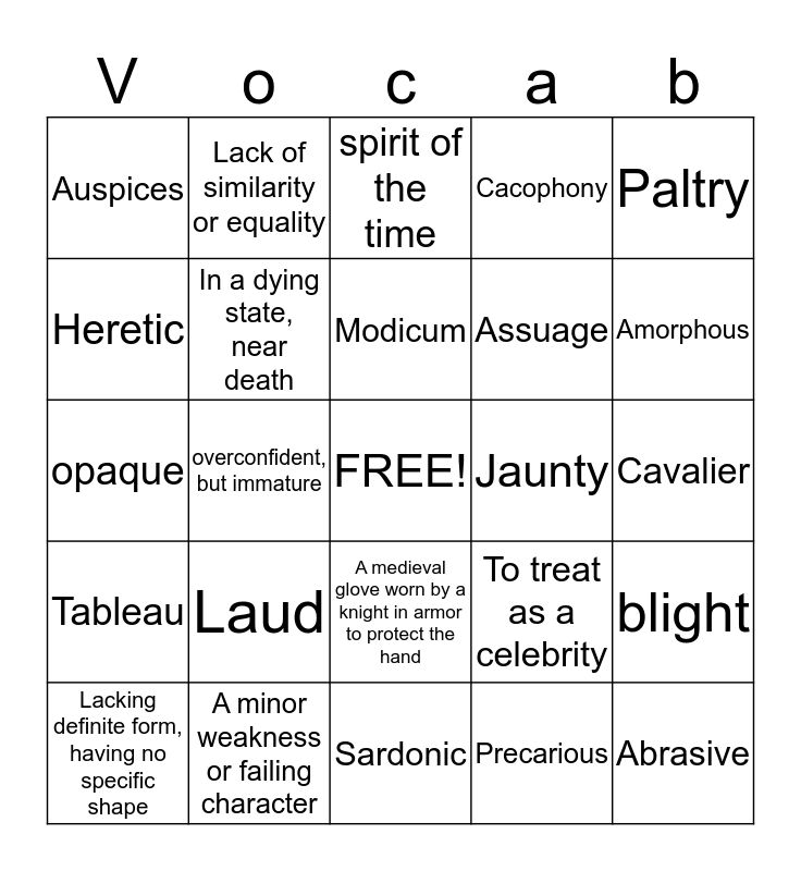 This bingo card has a free space and 24 words: Laud, A minor weakness or failing character, Modicum, Lacking definite form, having no specific shape, Paltry, Auspices, Heretic, Lack of similarity or equality, Jaunty, A medieval glove worn by a knight in armor to protect the hand, Assuage, opaque, To treat as a celebrity, blight, In a dying state, near death, Precarious, Cavalier, spirit of the time, Amorphous, overconfident, but immature, Abrasive, Tableau, Cacophony and Sardonic.