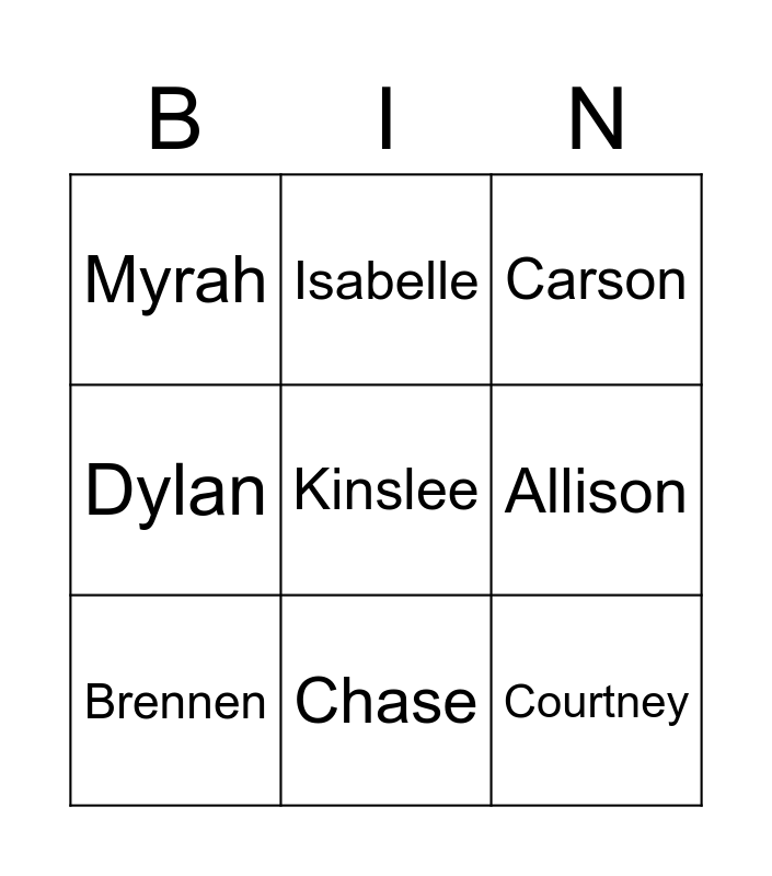 This bingo card has a free space and 13 words: Hannah, Annika, Brennen, Isabelle, Dylan, Courtney, Kayla, Ava, Chase, Myrah, Allison, Carson and Señora Wiedel.