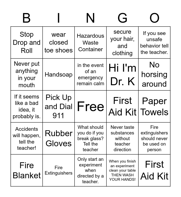 This bingo card has a free space and 29 words: Fire Blanket, Phone, Pick Up and Dial 911, Safety Goggles, Stop Drop and Roll, Hazardous Waste Container, Handsoap, Rubber Gloves, First Aid Kit, Fire Extinguishers, Paper Towels, First Aid Kit, Only start an experiment when directed by a teacher., When you finish an experiment clean your table THEN WASH YOUR HANDS!, No horsing around, Never help yourself to any liquids in the room., What should you do if you break glass? Tell the teacher, Accidents will happen, tell the teacher!, If you see unsafe behavior tell the teacher., If it seems like a bad idea, it probably is., Never taste substances without teacher direction, Work only with equipment and materials you were directed to use., Hi I'm Dr. K, Never put anything in your mouth, secure your hair, and clothing, wear closed toe shoes, Fire extinguishers should never be used on person, in the event of an emergency remain calm and never pick up heated glassware with bare hands.