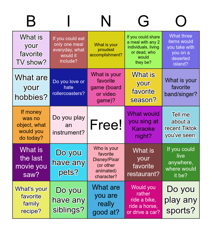 This bingo card has a free space and 24 words: Do you have any pets?, Do you have any siblings?, What is your favorite game (board or video game)?, What's your favorite family recipe?, What three items would you take with you on a deserted island?, What is your favorite TV show?, What are your hobbies?, If you could eat only one meal everyday, what would it include?, What would you sing at Karaoke night?, Who is your favorite Disney/Pixar (or other animated) character?, What is your favorite season?, If money was no object, what would you do today?, What is your favorite restaurant?, If you could live anywhere, where would it be?, Do you love or hate rollercoasters?, Would you rather ride a bike, ride a horse, or drive a car?, Tell me about a recent Tiktok you've seen., What is your proudest accomplishment?, What is your favorite band/singer?, Do you play an instrument?, Do you play any sports?, What is the last movie you saw?, If you could share a meal with any 2 individuals, living or dead, who would they be? and What are you are really good at?.
