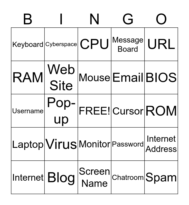 This bingo card has a free space and 24 words: Virus, Blog, Mouse, Internet, URL, Keyboard, RAM, Cyberspace, Cursor, Monitor, Email, Username, Password, Internet Address, Web Site, Chatroom, ROM, CPU, BIOS, Pop-up, Spam, Laptop, Message Board and Screen Name.