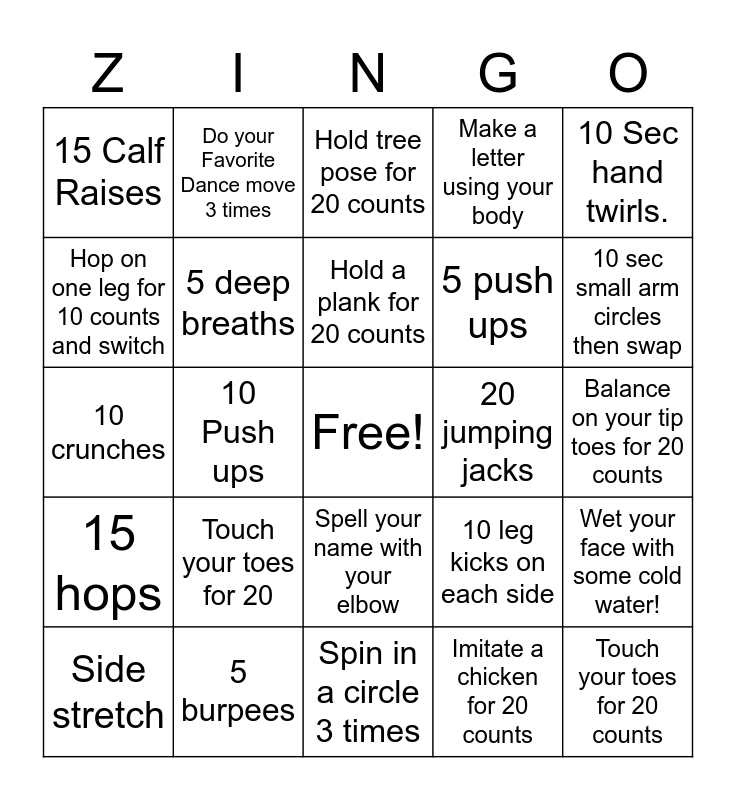 This bingo card has a free space and 24 words: Touch your toes for 20, 5 burpees, Hold a plank for 20 counts, Side stretch, 10 Sec hand twirls., 15 Calf Raises, Hop on one leg for 10 counts and switch, Do your Favorite Dance move 3 times, 20 jumping jacks, Spell your name with your elbow, 5 push ups, 10 crunches, 10 leg kicks on each side, Wet your face with some cold water!, 5 deep breaths, Imitate a chicken for 20 counts, Balance on your tip toes for 20 counts, Hold tree pose for 20 counts, 10 sec small arm circles then swap, 10 Push ups, Touch your toes for 20 counts, 15 hops, Make a letter using your body and Spin in a circle 3 times.