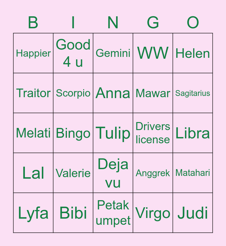 This bingo card has a free space and 24 words: Valerie, Bibi, Anna, Lyfa, Helen, Happier, Traitor, Good 4 u, Drivers license, Deja vu, Mawar, Melati, Anggrek, Matahari, Scorpio, Virgo, Libra, Gemini, Sagitarius, Bingo, Judi, Lal, WW and Petak umpet.